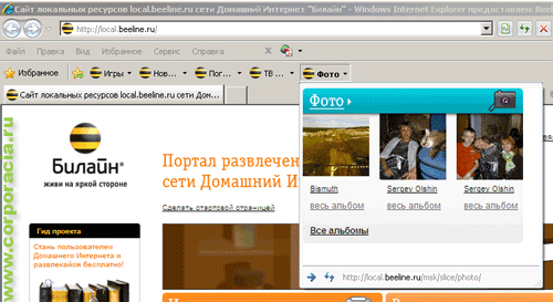 Билайн запустил специальную версию интернет-браузера Microsoft Internet Explorer 8 для абонентов "Домашнего Интернета". Спецверсия известного браузера разработана совместно с корпорацией Microsoft и отличается наличием web-фрагментов развлекательных ресурсов внутренней сети Билайн ("Фото", "Форум", "Новости", "Игры", "Погода" и "ТВ-программа").