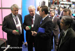Генеральный директор ЗАО "НЭК Инфокоммуникации" Михаил Заскалет представляет стенд компании на выставке "ИнфоКом'2006" зам.министра связи Борису Антонюку и секретарю совета безопасности РФ Владиславу Шерстюку.