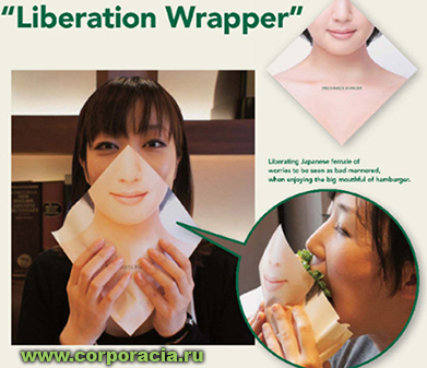 Liberation Wrapper – это специальные конверты, с одной стороны которых нарисована нижняя часть лица человека. Таким образом, бургер помещается в конверт и заслоняет красивой картинкой процесс его поглощения.