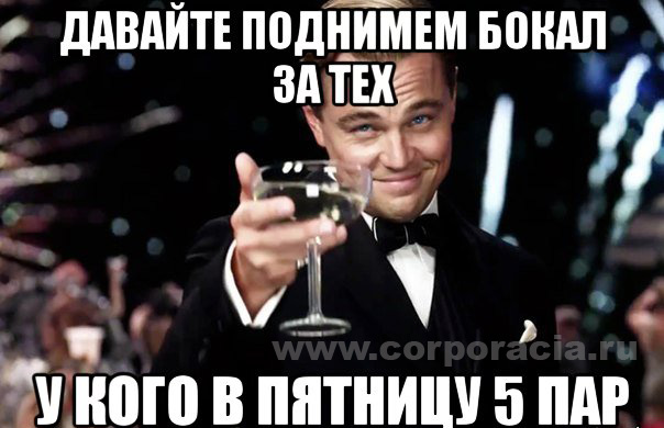 Мем появился после выхода экранизации романа Френсиса Скотта Фиджеральда "Великий Гетсби", главную роль в котором исполнил Леонардо Дикаприо. Картинка взята как раз из того момента, когда главный герой - таинственный Гетсби, впервые появляется на экране. В последствие было создано большое количество мемов, значение которых варьируется от вполне позитивной оценки человека до ироничного сочуствия тому, за кого поднимается бокал. |