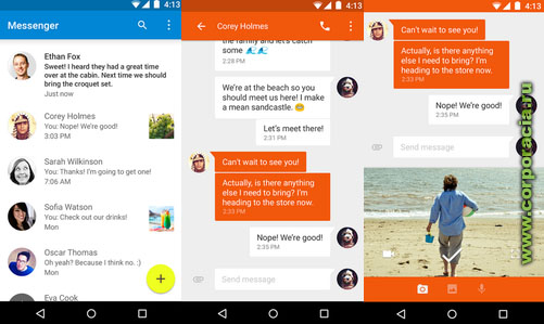 Программа "Чат" по умолчанию устанавливается на девайсы, выпускаемые с новой операционной системой Android 5.0 Lollipop, однако она открыта для эксплуатации всем пользователям гаджетов на Android 4.1 и выше. "Чат" выполнен в новом графическом решении Material Design и может присвоить каждому контакту, с которым ведется переписка отдельный цвет.