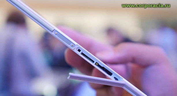 На тонких торцах девайса разработчики умудрились расположить все необходимые функциональные кнопки и разъемы: клавишу питания, двухпозиционную кнопку регулировки громкости, гнездо для гарнитуры, разъем для SIM-карты, microSD, microUSB и т.п.
