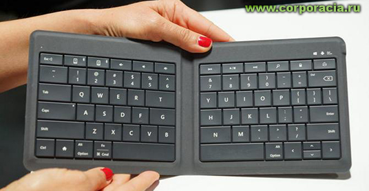 Также Microsoft представила универсальную клавиатуру для iOS-, Android- и Windows-девайсов. Клавиатура может подключаться по Bluetooth одновременно к нескольким девайсом и переключаться между ними с помощью свайпа. Нельзя не отметить компактность клавиатуры – за счет специального механизма ее можно сложить пополам.