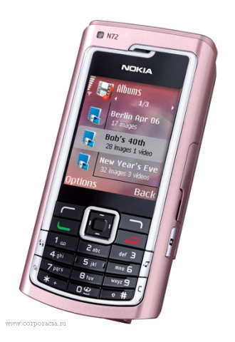 В Nokia N72 нет какого-то набора особых функций. Акцент сделан на дизайне корпуса (особенно интересен розовый, женский вариант). Бархатно-шероховатый корпус прикрыт двумя лакированными игриво бликующими на солнце «крышками». Под задней прячется объектив камеры и вспышка (открытие крышки запускает камеру автоматически), а передняя выполняет исключительно декоративную функцию. Ее округлые края вкупе с серебристой окантовкой визуально делают аппарат тоньше. С тыльной стороны он не кажется таким изящным, что частично компенсируется гравировкой, на которую обычно и обращают внимание.