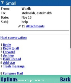 разрешения Nokia E60 также позволяет комфортно взаимодействовать с почтой (процесс изображен на скриншотах). Преимущество такого вида отображения — то, что мы видим на экране