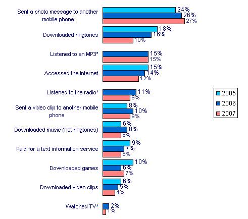 Согласно исследованию, проведенному компанией Continental Research, пользователи мобильных телефонов не выказывают особого интереса к передовым функциям своих устройств, например, доступу в интернет или просмотру ТВ. По данным аналитиков, популярность 8 из 11 услуг такого рода снизилась за прошедший год. Лишь отправка сообщений с фотографиями, а также загрузка игр на мобильные телефоны стали происходить чаще. Использование встроенного MP3-плеера осталось на том же уровне по сравнению с прошлым годом.