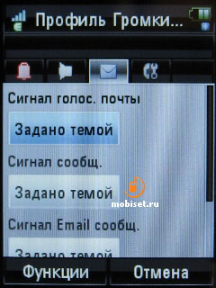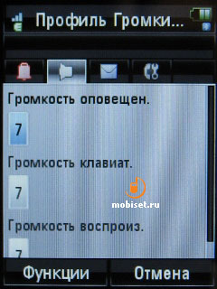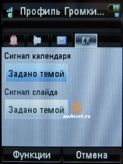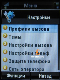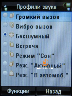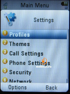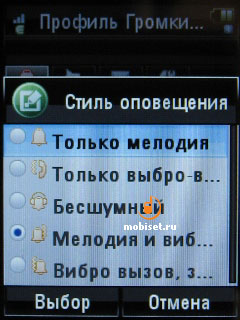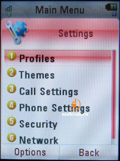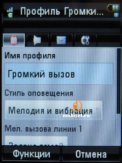 Все установки параметров работы сотового аппарата находятся в надлежащем пункте основного меню. Здесь же можно поменять настройки уже имеющихся профилей вызова и сделать свои. На звонок можно поставить любую мелодию, и она сможет проигрываться одновременно с включенной вибрацией. Кроме того, можно настраивать уровень громкости всех сигналов, а также звуки событий и отдельных приложений.