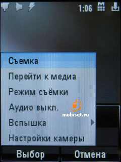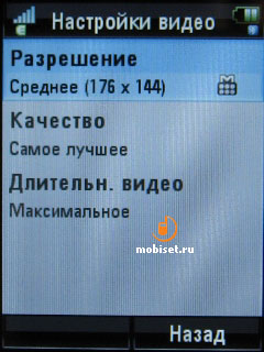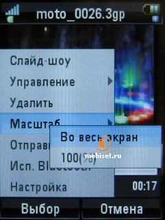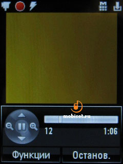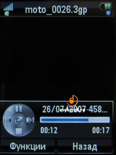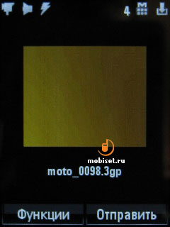 Прямо из главного меню, или из меню камеры можно перейти в режим записи видео. Ориентация интерфейса при этом зависит от состояния сотового аппарата. Все установки камеры, включая восьмикратный зум и стили, вы можете изменять прямо во время съемки. Съемку видеоролика можно приостановить, нажав на паузу, и после продолжить. Время записи видео зависит от свободного места на диске или от того, каким образом настроена видеозапись (максимальная длительность, короткое и длинное MMS). MOTOROKR Z6 поддерживает два типа разрешения (96х128 и 144х176) и 3 уровня сжатия; также вы можете отключить звук при записи, если он вам не нужен. Высокое качество видеозаписей радует (формат 3gp, 183 Кбит/с, 13 кадров в секунду), но вот небольшое разрешение удручает.