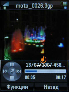 Внешний вид видеопроигрывателя почти не отличается от проигрывателя аудио-файлов. Для просмотра ролика в полноэкранном режиме нужно всего лишь нажать клавишу выбора. Видеоролик можно перемотать во время воспроизведения. Можно настроить плеер таким образом, чтобы он воспроизводил видеоролик в его настоящем размере(обычно записи масштабируются по размеру дисплея). Одной из самых необычных опций является возможность создавать