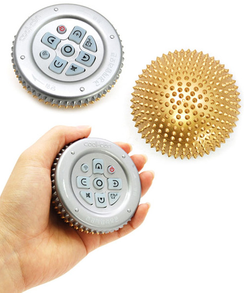 Существует несколько групп гаджет-штучек, две самых популярных - это которые заботятся об окружающей среде, и которые хоть чуть-чуть имеют связь со здоровьем. Пульт без раздумий относим к последней группе. Разработан южнокорейскими специалистами и сочетает в себе основы античную технику акупунктуры, терапия действует благодаря массированию специальных точек. Раньше была, да и сейчас наверно есть где то в продаже, обувь с резиновыми шипами в подошве. Устройство именуется как cool.con (именно так с маленькой буквой и через точку) и выполнено в виде половинки шара, шарообразная часть которой покрыта теми самыми шипами, с другой стороны функциональная часть изделия, клавиши пульта дистанционного управления. Стоимость массажиста от 400 рублей.