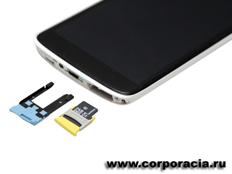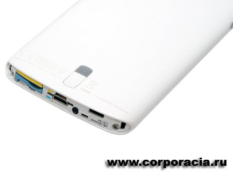 Все имеющиеся элементы на боковых панелях телефона – это кнопка громкости, расположенная на левой грани, microUSB-разъем и микрофон на нижней; 3,5мм аудио-разъем и кнопка питания дисплея на верхней. На задней же панели располагается 8-Мп камера, второй микрофон и разъем для лампочки. Для открытия нижней панели телефона внизу располагается кнопка, совмещенная с динамиком. Там находится отсек для SIM-карты и карты памяти, располагающиеся одна под другой. 1900 mAh аккумулятор является несъемным элементом.