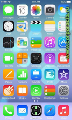 На снимке можно заметить измененное соотношение сторон дисплея, на экране мы видим – 5 колонок и 7 рядов приложений, новые приложения CarPlay, Healthbook и Watch Utility, также можно заметить, что программы iWork и iLife предустановлены.