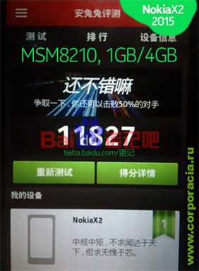 Однако девайс получил неплохую популярность, и в последнее время в сети стали "гулять" слухи о выпуске Nokia X2, а на днях китайский ресурс Baidu со ссылкой на инсайдера опубликовал скрин бенчмарка, запущенного с нового смартфона. Синтетический тест говорит о наличие у девайса 1 Гб оперативной памяти и 4 Гб встроенной. Суммарный балл – 11827, при том что Nokia X набирает обычно порядка 7400.