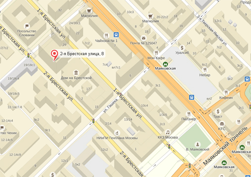 125047, г. Москва, м. Маяковская, Вторая Брестская улица, д.8, этаж 10.