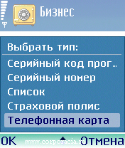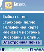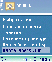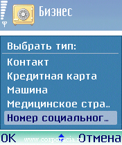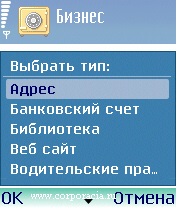 Входим в «Бизнес» и нажимаем левую софтовую клавишу смарта, вызывая меню. В меню выбираем опцию «Новая запись». На экране возникнет длинный список типов записей. А именно – «
