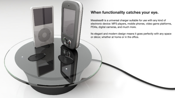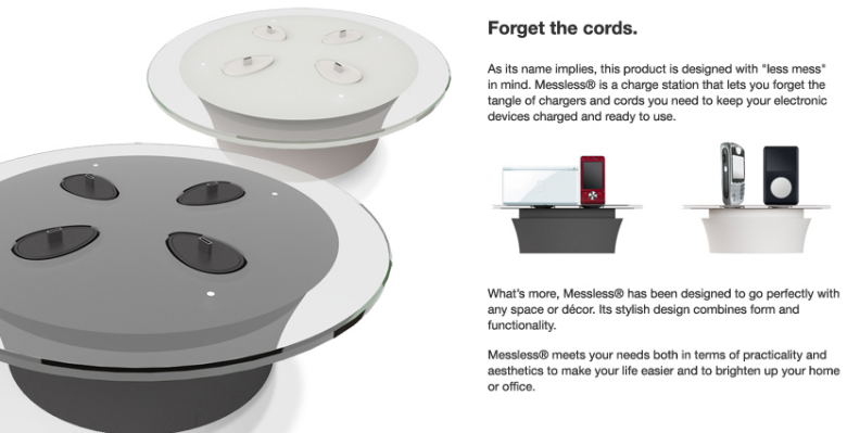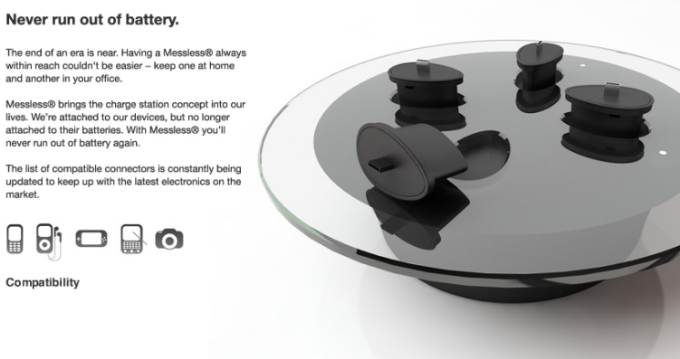 Messless Charger представляет собой монолитную подзарядную станцию. Так как устройство снабжено коннекторами шести неодинаковых типов, это позволяет использовать его для подзарядки самых разнообразных электронных устройств: MP3-плейеров, телефонов, консолей, КПК, фотоаппаратов и т.д. На стильном глянцевом «подносике» смогут заряжаться аж четыре устройств одновременно. Презентабельный внешний вид устройства плюс вариант спастись от массы проводов и от нужды ходить в поисках свободной розетки, волнует цена Messless Charger до $100.