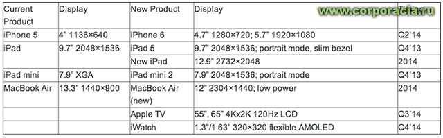Кстати сказать, таблица интересна не только этим. Во-первых, большой интерес представляет самая последняя ее строчка – iWatch, а значит, скорее всего, мы наконец-то увидим "умные" часы от Apple. Во-вторых, видно, что следующий iPad получит тот же дисплей, что и предшественники, iPad mini ждет Retina-дисплей, а также же то, что мир познакомится с новым 12,9-дюймовым iPad для бизнеса. Кроме того, нас ждет MacBook Air с энергоэффективной 12-дюймовой матрицей разрешения 2304 на 1440 точек, появится и долгожданное Apple TV.