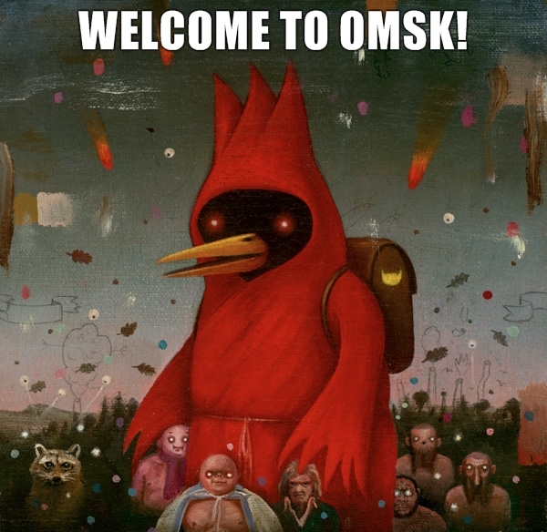 Омская птица, как и полагается, пришла к нам из города Омска, в интернете больше известного, как “столица-норкоманов”. Эту самую птицу можно найти в интернете под различными кодовыми именами, такими, например, как Winged Doom, Омская ворон, Птица-омич, Lil’ Bird of Doom, Вингедум. История омской птицы началась с известного немецкого художника Хайко Мюллера, который, собственно говоря, ее и нарисовал. Изначально эта картинка носила название “Winged Doom”, что в дословном переводе звучит как “крылатый рок”. Но, как обычно бывает это в интернете, картинку своровали, и написали на ней “добро пожаловать в Омск!”. Что же до немца, то он знает о судьбе своей картинки в России, и даже рад этому.